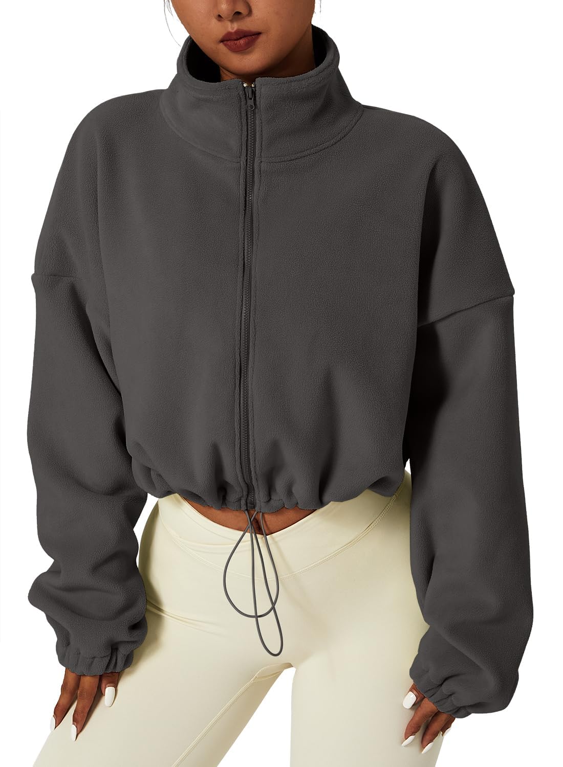 QINSEN Women's Full Zip Fleece Short Jacket Warm Winter Long Sleeve Stand Collar Sherpa Crop Coat