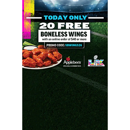 Big Game Day Offers: Applebee's 20 Boneless Wings Free w/ $40+ Order & Many More