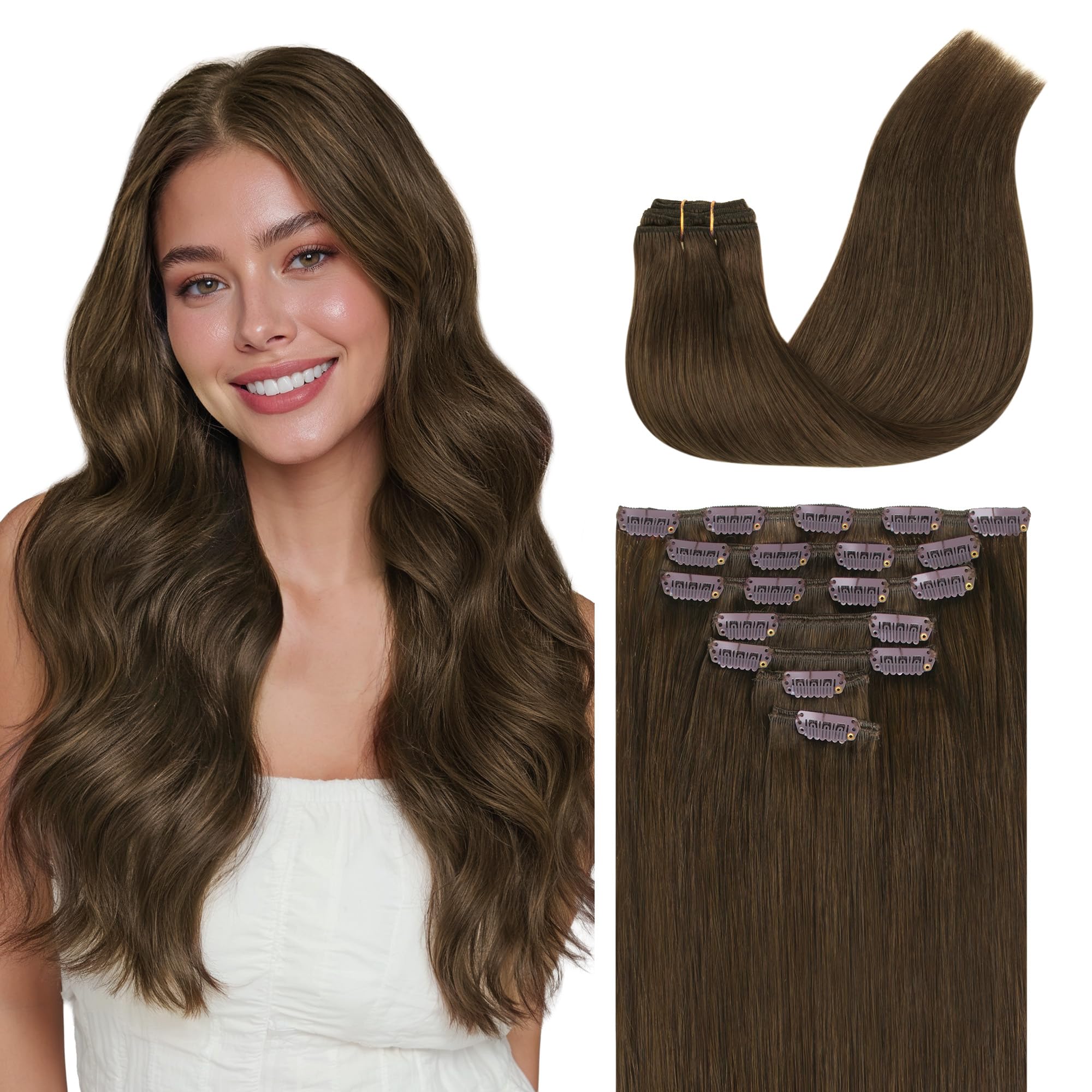 GOO GOO Clip in Hair Extensions Real Human Hair, Remy Human Hair Extensions Clip ins for Women, Natural Human Hair, 14inch 120g 7 Pcs, #4H Light Chocolate Brown